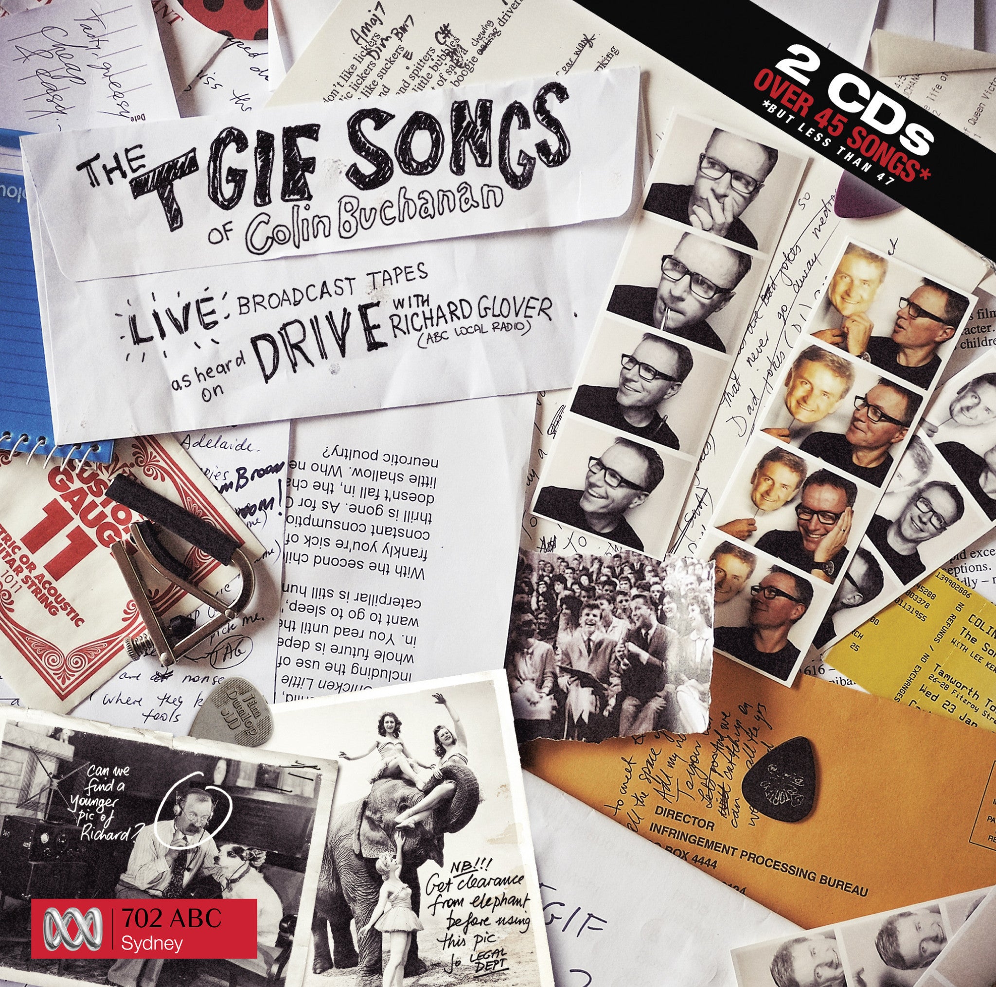 For over a decade, Colin Buchanan has been a regular panelist on ABC Sydney 702 Drive's weekly satirical comedy roundup "Thank God It's Friday", the brainchild of top-rating drive radio presenter/writer/journalist Richard Glover. The TGIF concept was simple - Richard would ask leading questions of a panel of comics who would attempt to be as funny as possible, providing a light-hearted cap-off to the broadcasting week. What began as Colin's occasional contribution of a purpose-built song quickly became an expectation of host - and audience - alike. Armed with his guitar and not much notice, Colin's unique, quirky, amusing and, at times, poignant tunes have become a fixture of what is a Sydney radio institution. "The TGIF Songs of Colin Buchanan" is an opportunity to relive the moment these new songs were released to the world, a 2 CD collection of Colin's warts-and-all, free-falling live performances captured alongside his fellow panelists and in front of the TGIF studio audience as they were broadcast live across Sydney and accross the state. It's a unique album, bearing testimony not only to Colin's diverse songwriting and his place in the wider music industry, but to his impressive ability to deliver crushingly bad puns with total conviction - all with no safety net!